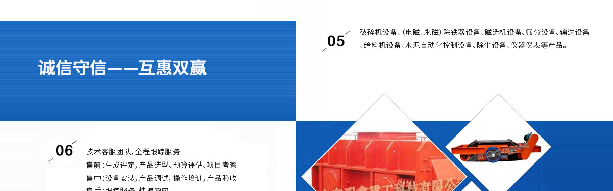 山東明鑫重工科技有限公司為是集科研開發,設計制造、銷售、安裝、調試為一體的技術制造企業。公司位于美麗的國際風箏都-濰坊市(國家AAAA級森林公園-沂山景區駐地)臨朐東城工業園。本公司產品種類有:破碎機設備,(電磁、永磁)除鐵器設備,磁選機設備,篩分設備,輸送設備,給料機設備,水泥自動化控制設備、除塵設備,儀器儀表等產品。其產品有五十多個系列,四百多種規格,并可根據客戶需求設計生產相應的產品。其產品廣泛應用于冶金、電力、煤炭、礦山、造紙、食品、化工建材、耐火材料、磚瓦、水泥、玻璃等行業,產品暢銷國內三十多個省市、自治區。